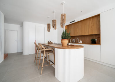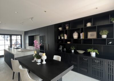 Full villa custom carpentry – master and guest bedroom wardrobes and cabinetry, bespoke kitchen and living room surround in wall panels.